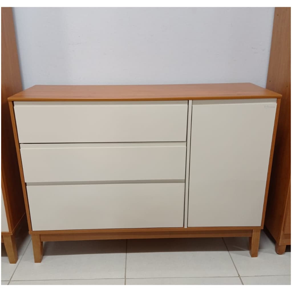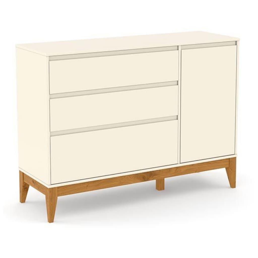 Cômoda 3 Gavetas e 1 Porta – Pés e Rodapés em Madeira Maciça – Cor Freijo Off White