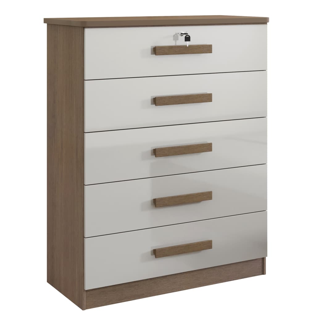 Cômoda 5 Gavetas Cor Castanho Off White – 1 Gaveta Com Chave