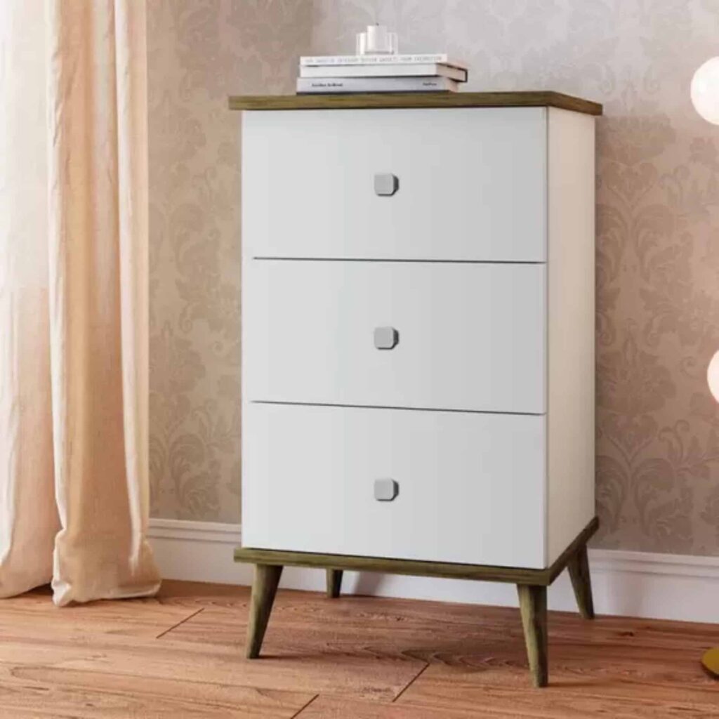 Cômoda 3 Gavetas e 1 Porta – Pés e Rodapés em Madeira Maciça – Cor Freijo Branca