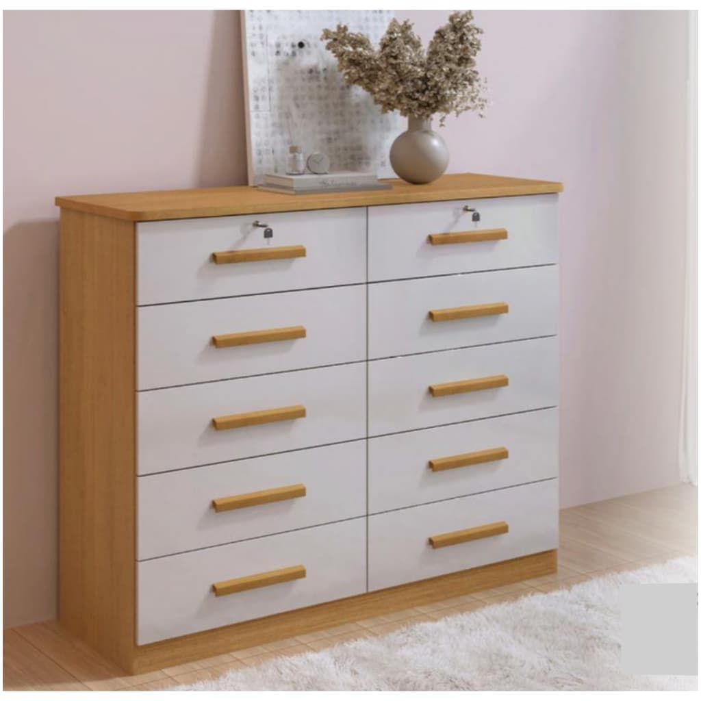Cômoda 5 Gavetas Cor Cinamomo Off White – 1 Gaveta Com Chave