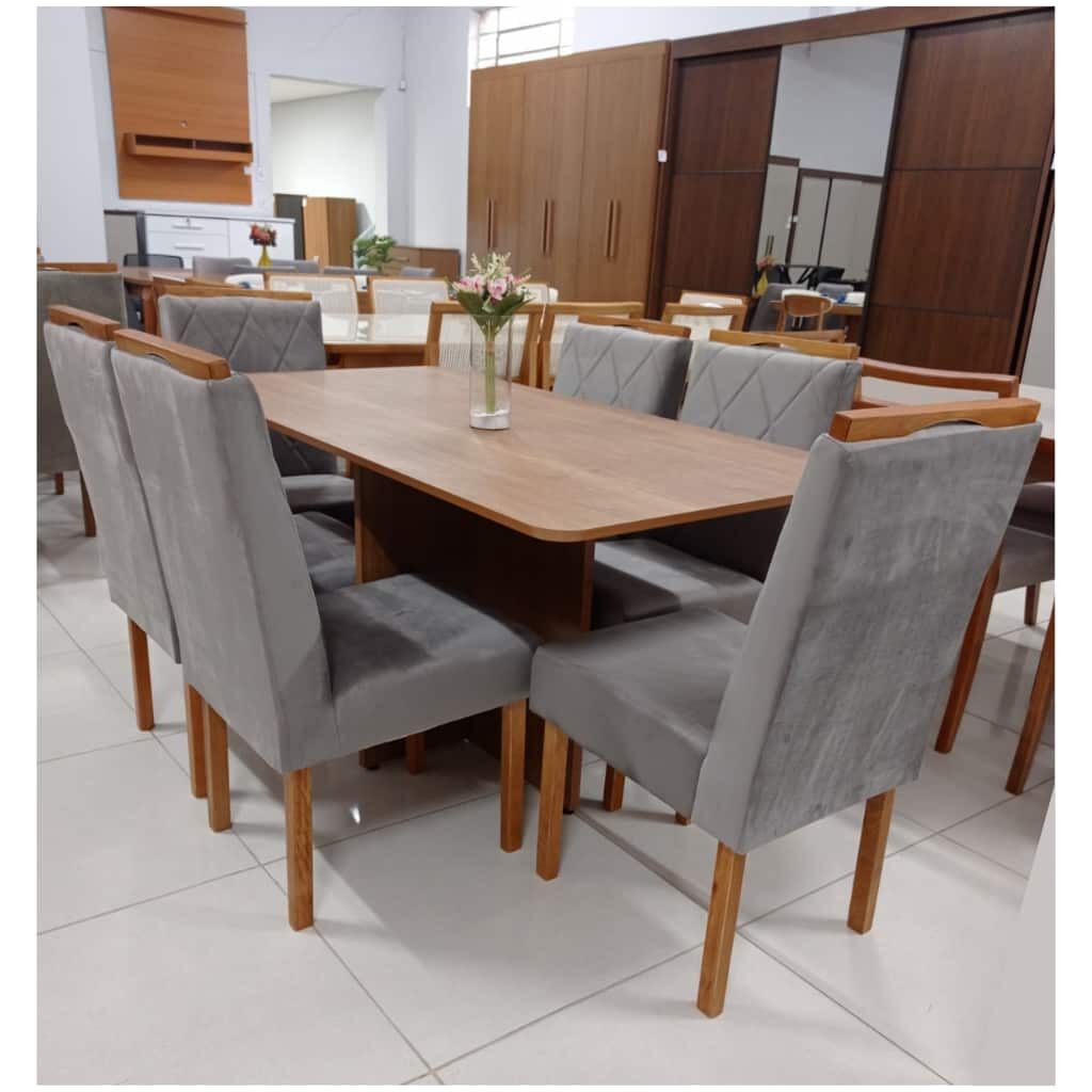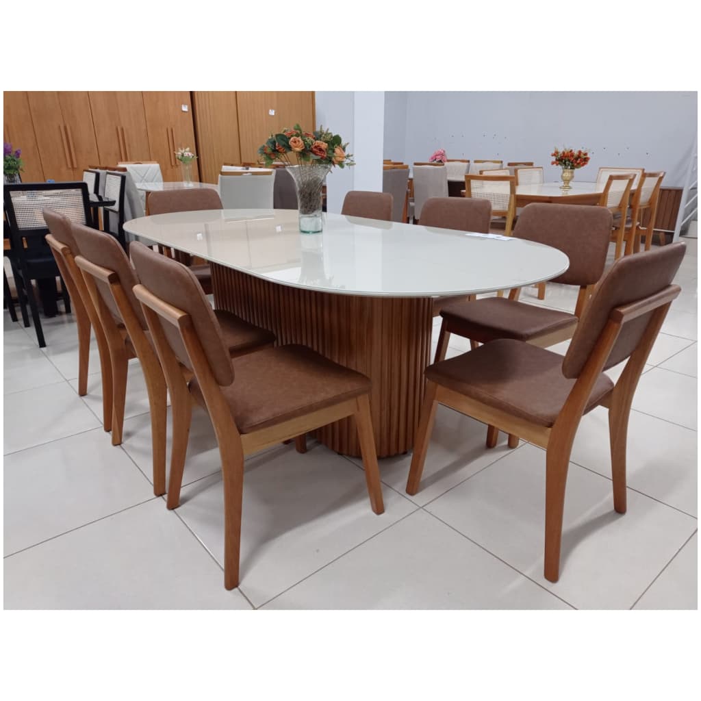 Mesa de Jantar Tampo Oval Com 8 Cadeiras em Madeira – Tecido Facto Marrom