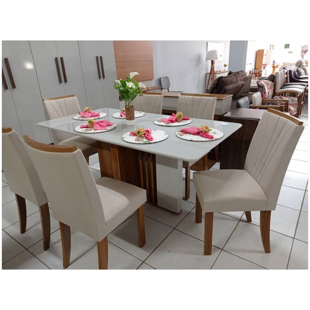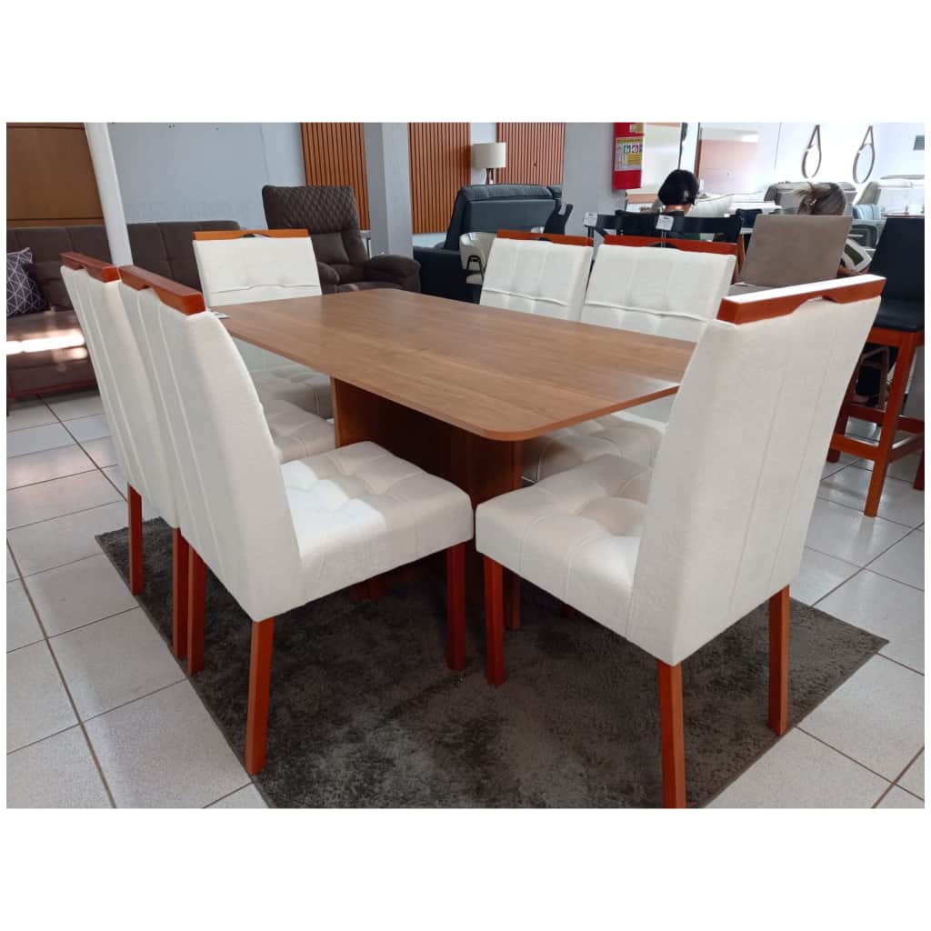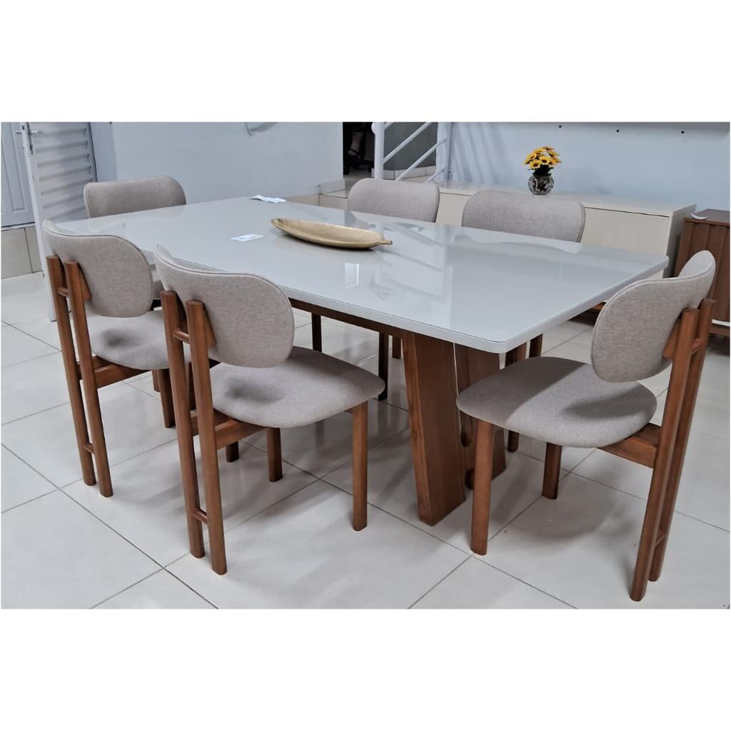 Mesa de Jantar Retangular Off White Com 6 Cadeiras em Madeira – Tecido Linho Bege