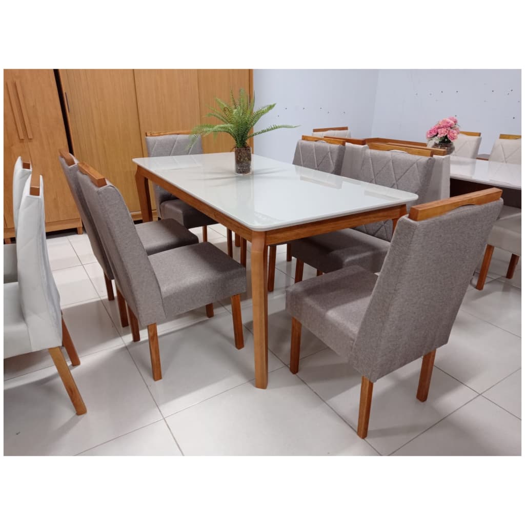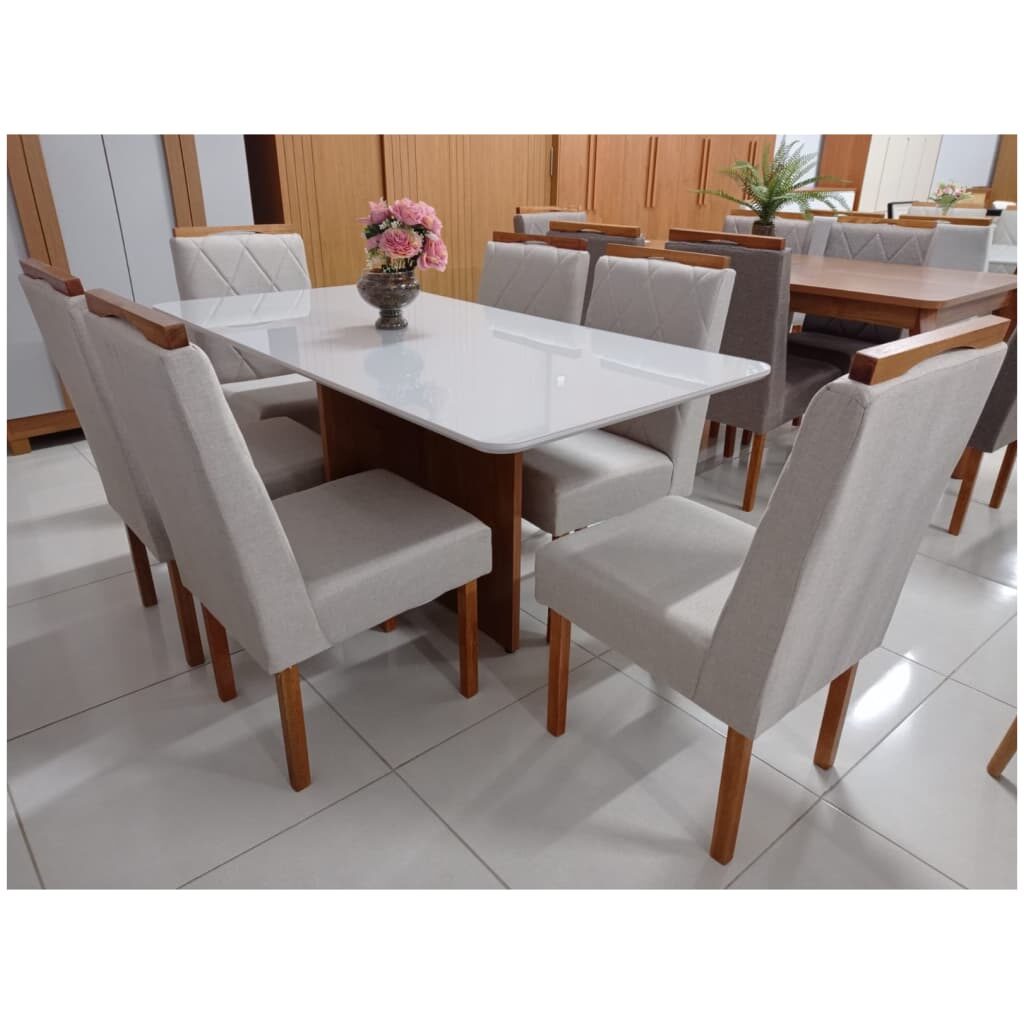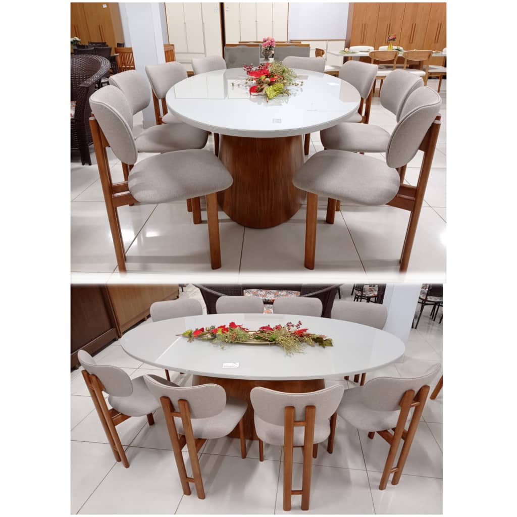 Mesa de Jantar Tampo Oval Off White Com 8 Cadeiras em Madeira no Tecido Linho