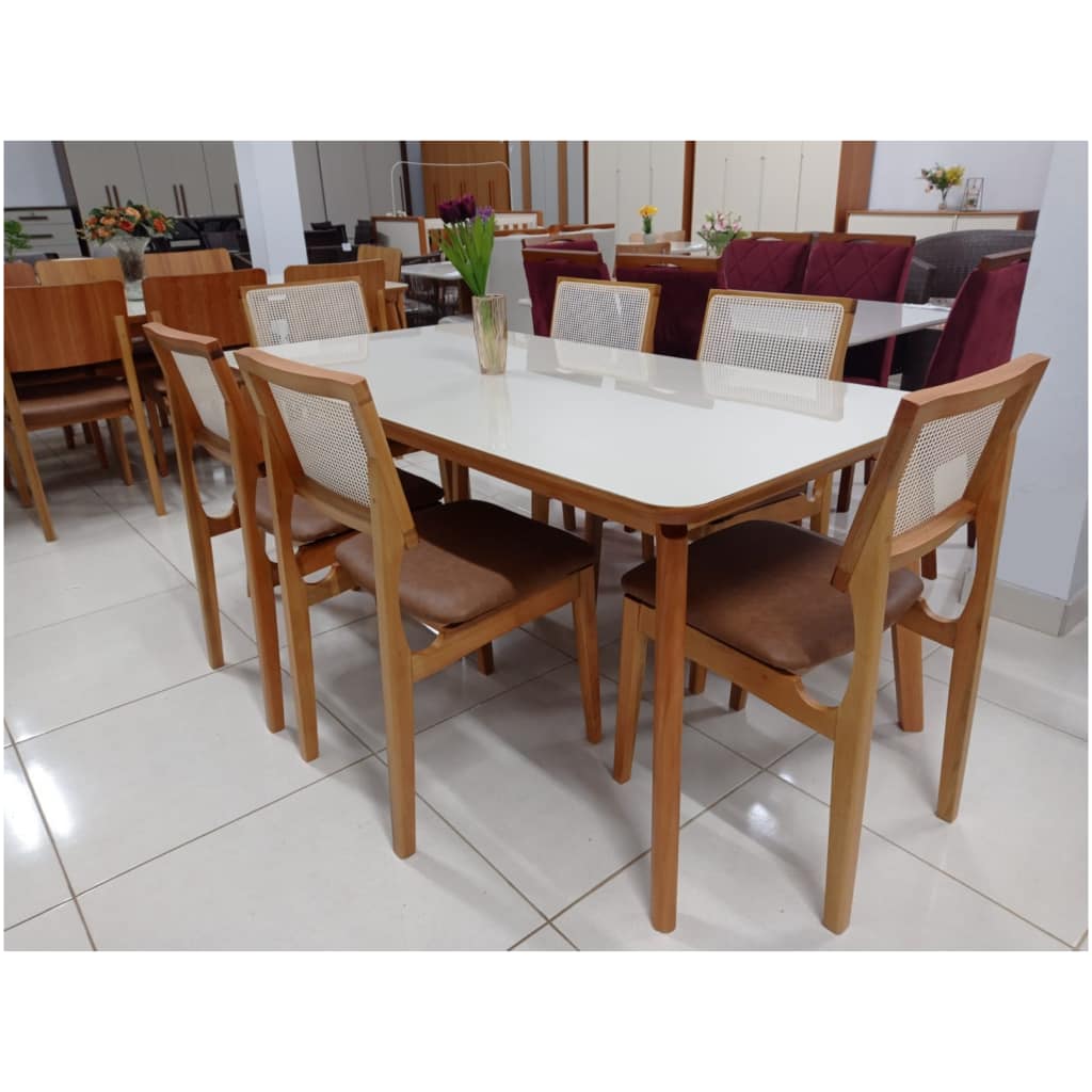 Mesa de Jantar Retangular Off White Com 6 Cadeiras em Madeira – Assento no Linho