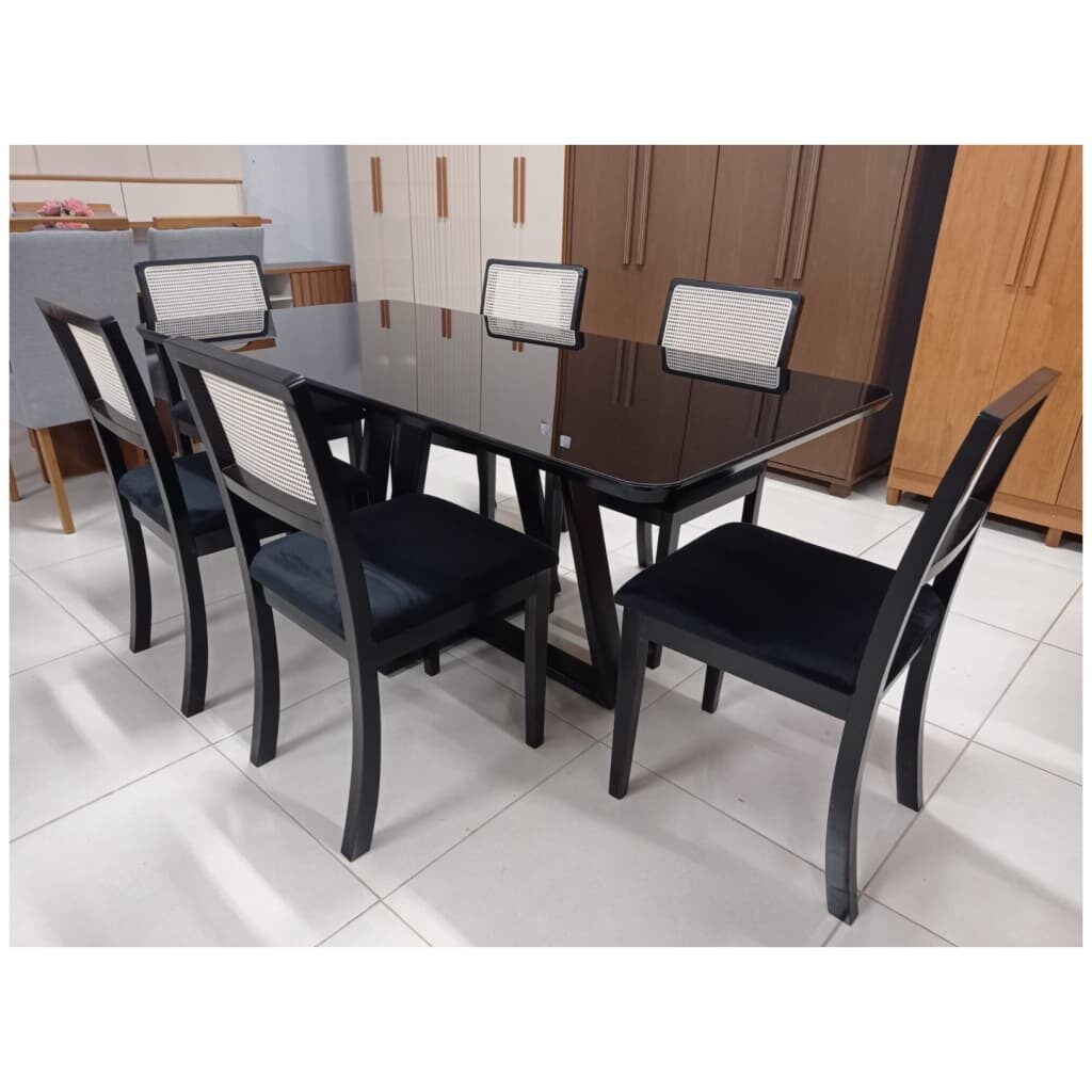 Mesa de Jantar Retangular Laca Preta Com 6 Cadeiras em Madeira – Tecido Veludo Preto