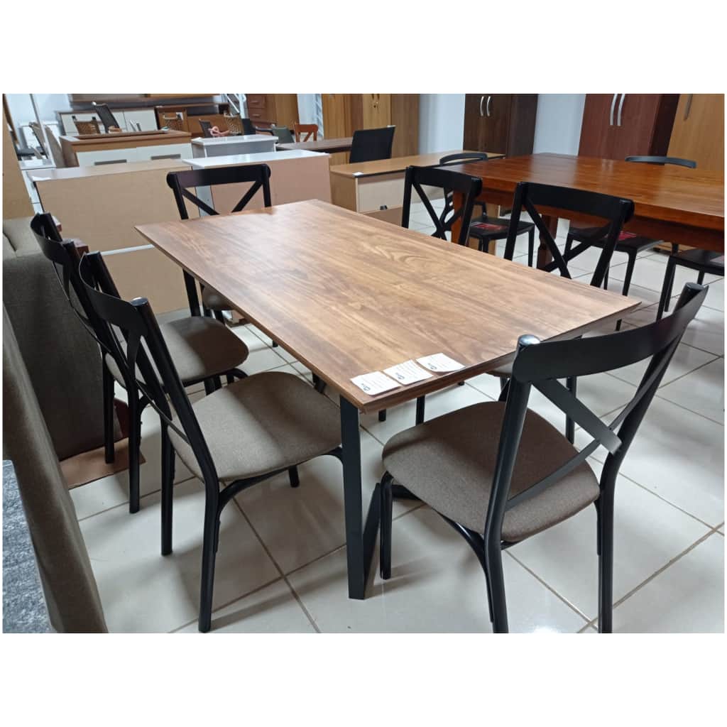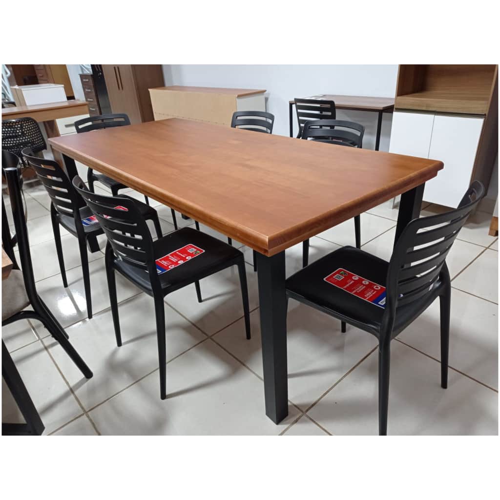Mesa de Jantar Tampo em Madeira Maciça Com 6 Cadeiras – Estrutura em Metal Preto