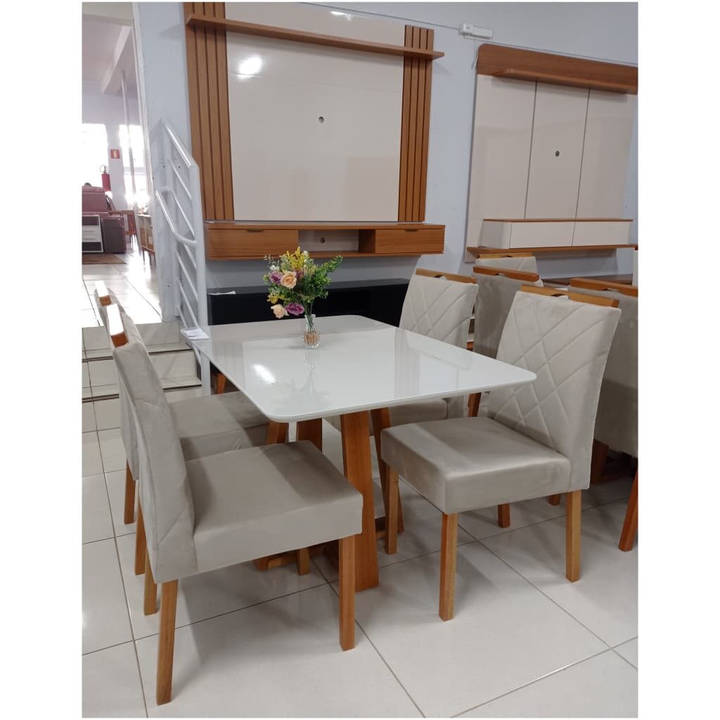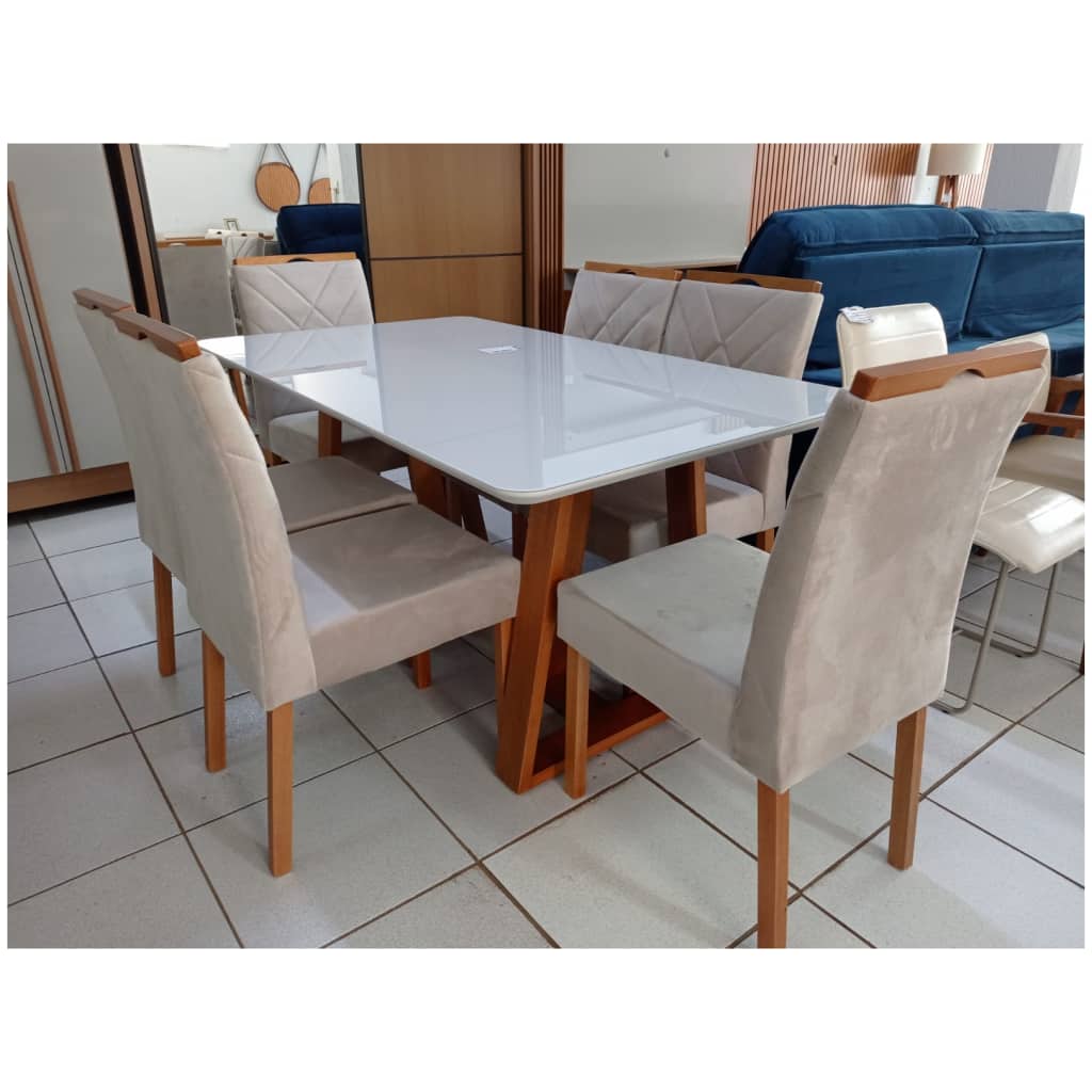 Mesa Retangular Off White Com 6 Cadeiras em Madeira – Tecido Veludo