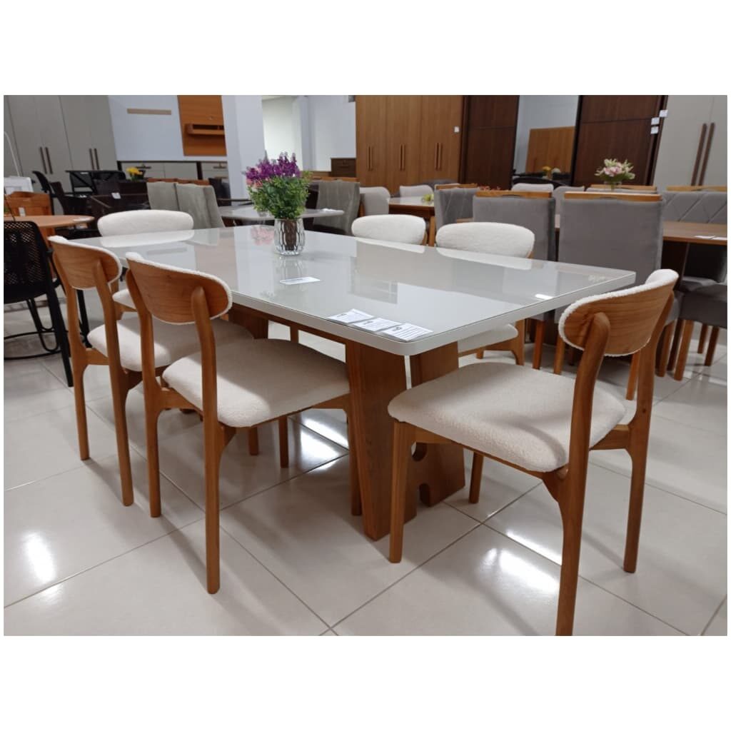 Mesa de Jantar Retangular Off White Com 6 Cadeiras em Madeira – Assento Bouclé Creme