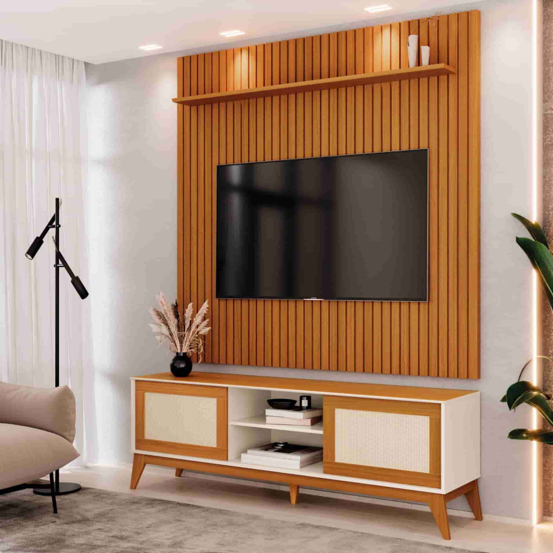 Rack e Painel Ripado Para TV Até 75″ – Pés em Madeira – 1,80m Largura – Cor Cedro Off White